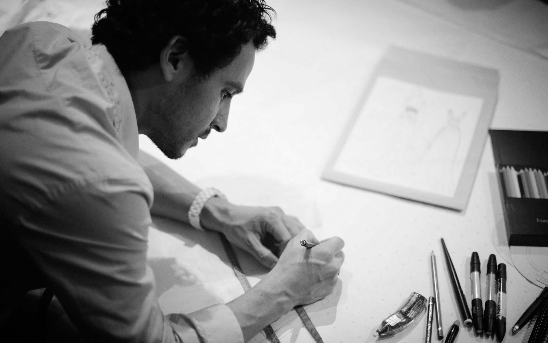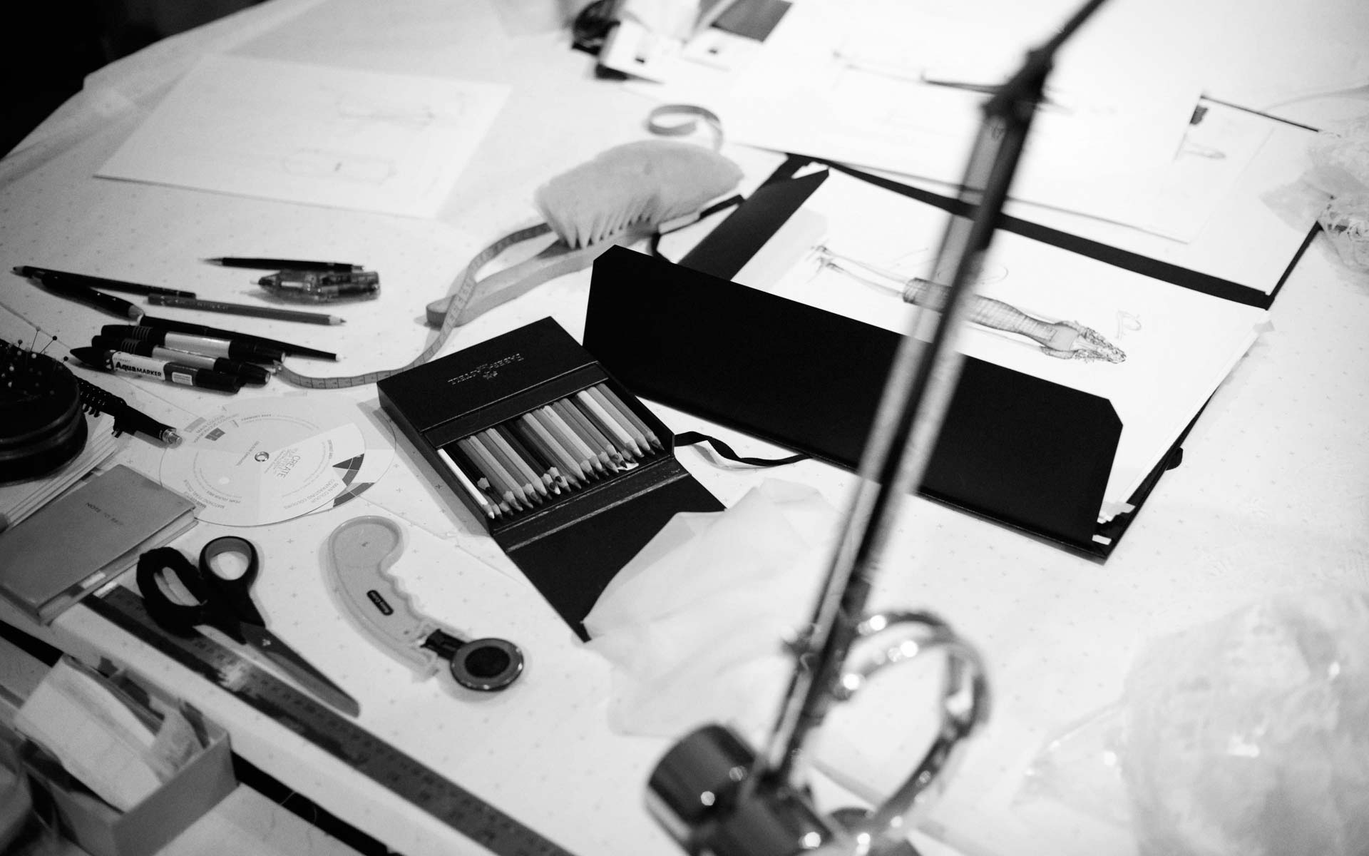 The course requires that the student is equipped with much of their basic apparatus, as well as being able to acquire their own fabrics and materials independently. The couturier will provide resources such as pattern paper, machinery and studio space, as well as guidance for selecting the best materials. Students are welcome to borrow metal rulers, pins and other equipment, however these will be needed for working at home so it is advisable to also have a personal supply.